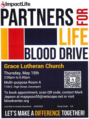 Grace Lutheran Church invites you to donate blood at their event on Thursday May 15th from 2 pm – 6 pm in Multi-Purpose Room A at the church (1140 E. High Street, Davenport).